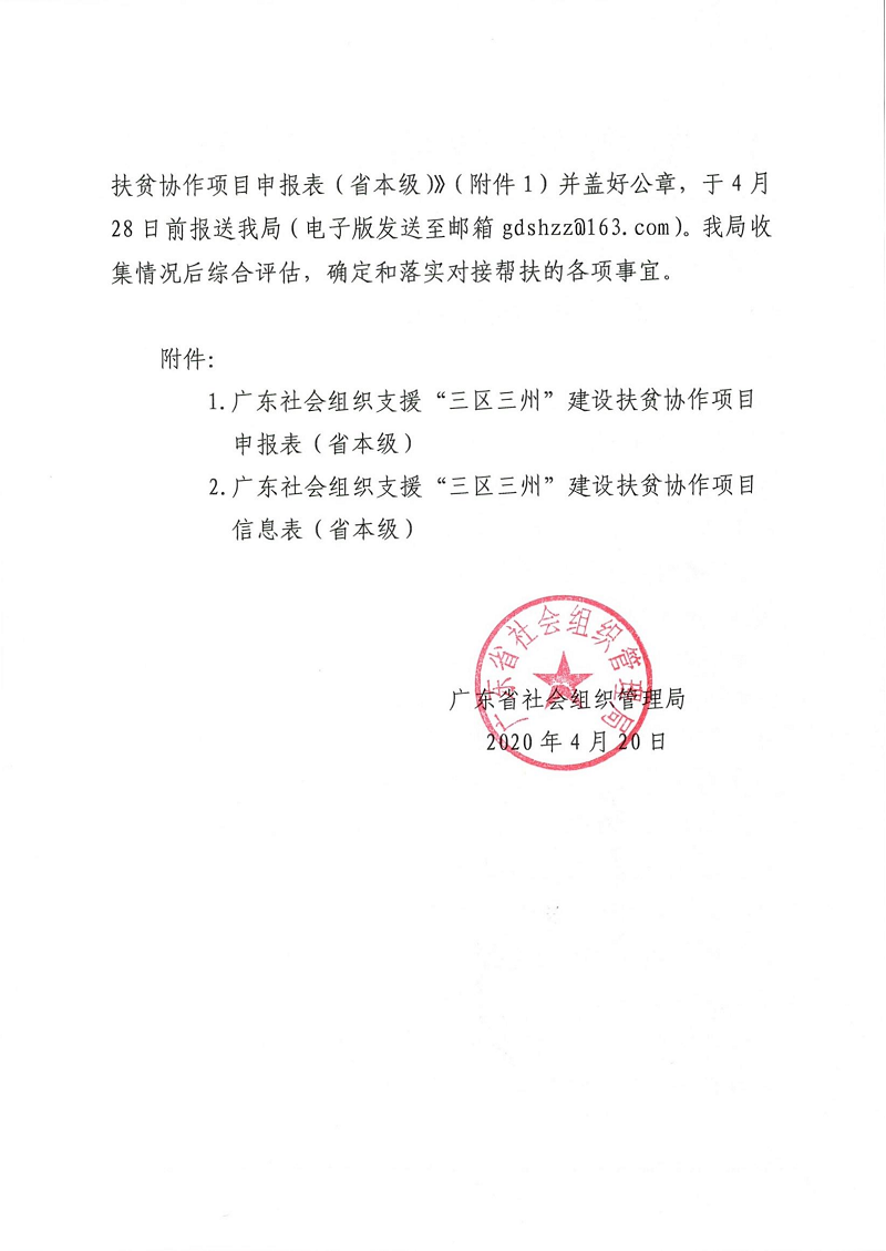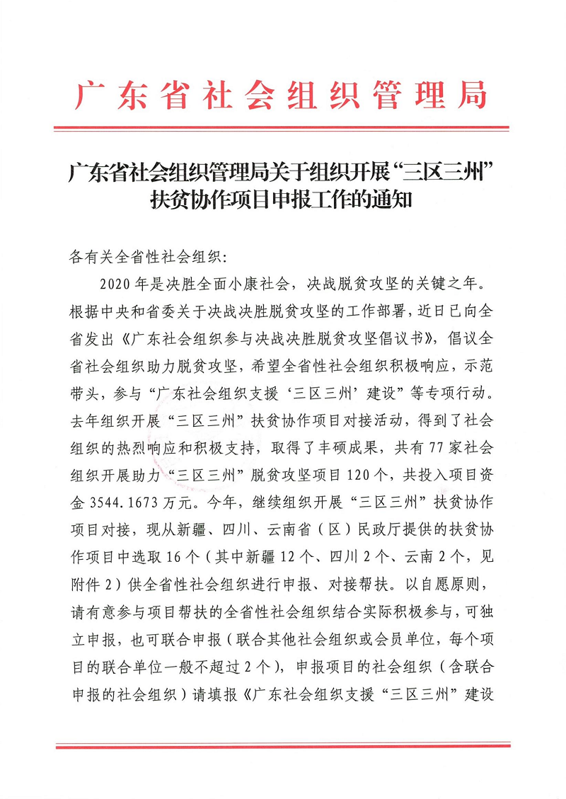 2020年是决胜全面小康社会,决战脱贫攻坚的关键之年。根据中央和省委关于决战决胜脱贫攻坚的工作部署,省社管局于近日已向全省发出《广东社会组织参与决战决胜脱贫攻坚倡议书》,倡议全省社会组织助力脱贫攻坚,希望全省性社会组织积极响应,示范带头,参与“广东社会组织支援‘三区三州’建设”等专项行动。2020年,省社管局从新疆、四川、云南省(区)民政厅提供的扶贫协作项目中选取16个(其中新疆12个、四川2个、云南2个,见附件2)供全省性社会组织进行申报、对接帮扶。我会将积极支持各会员单位以自愿原则,结合实际积极参与,可独立申报,也可联合其他会员单位共同申报,请有意向的会员单位填报好附件,并及时提交到协会秘书处联系邮箱:gdtyn99@163.com,我会收集情况后综合评估,确定和落实对接帮扶的各项事宜。