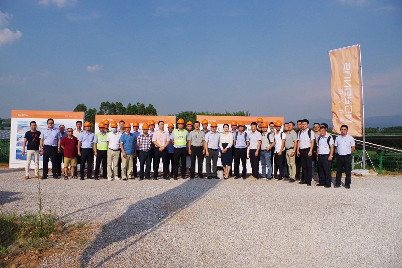 会后,所有参会领导嘉宾前往阳光电源股份有限公司-韶关市始兴县马市镇110MW农光互补光伏发电与荒山改良综合利用项目参观考察。据阳光电源股份公司 艾全晶 项目总监介绍,该项目 利用荒山荒地建成,因地制宜采用农光互补模式,板上光伏发电,板下种植的丰田密本、香芋、南瓜、野菊花等绿色作物,实现了立体构造、一地两用、复合收益。此外,基于始兴县自然资源优势,项目建成后可将新能源、农业和休闲旅游产业有机结合,发展“光伏发电+花卉观赏+瓜果采摘”为一体的生态旅游产业,促进一二三产业有效联动,为地区经济发展注入绿色新活力。在项目25年稳定运营期内,共计可提供清洁电力约28亿度,等效节约标准煤约111万吨,减排二氧化碳276万吨,将助力韶关市守好绿水青山,走出一条节能减排、企业增效、农民增收的多赢新道路。未来阳光电源将始终坚持为客户提供清洁能源全生命周期解决方案,并将安全生产的理念贯彻到每一个项目的施工建设中,严格标准,强化意识,始终把安全放在第一位,同时也欢迎各级领导单位随时考察。