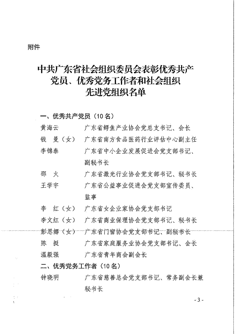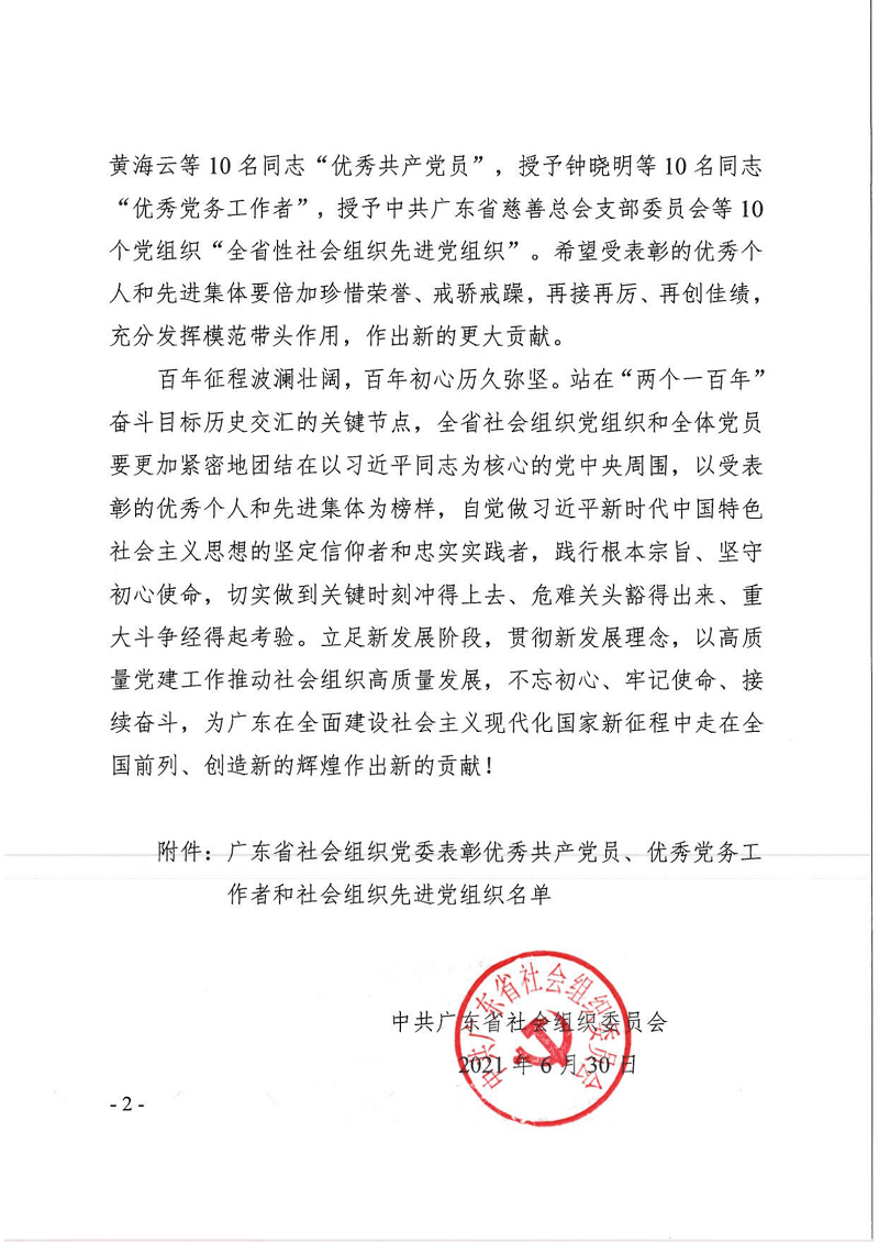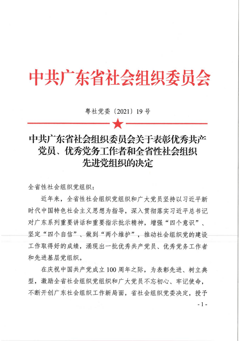 近年来,全省性社会组织党组织和广大党员坚持以习近平新时代中国特色社会主义思想为指导,深入贯彻落实习近平总书记对广东系列重要讲话和重要指示批示精神,增强"四个意识"、坚定"四个自信"、做到"两个维护",推动社会组织党的建设工作取得好的成绩,涌现出一批优秀共产党员、优秀党务工作者和先进基层党组织。其中我会党支部书记谢黎荣荣获中共广东省社会组织委员会颁发的“优秀党务工作者”称号。