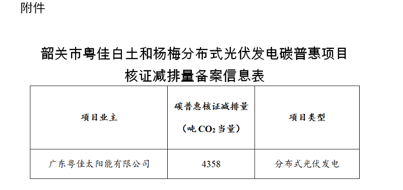 附件∶韶关市粤佳白土和杨梅分布式光伏发电碳普惠项目核证减排量备案信息表