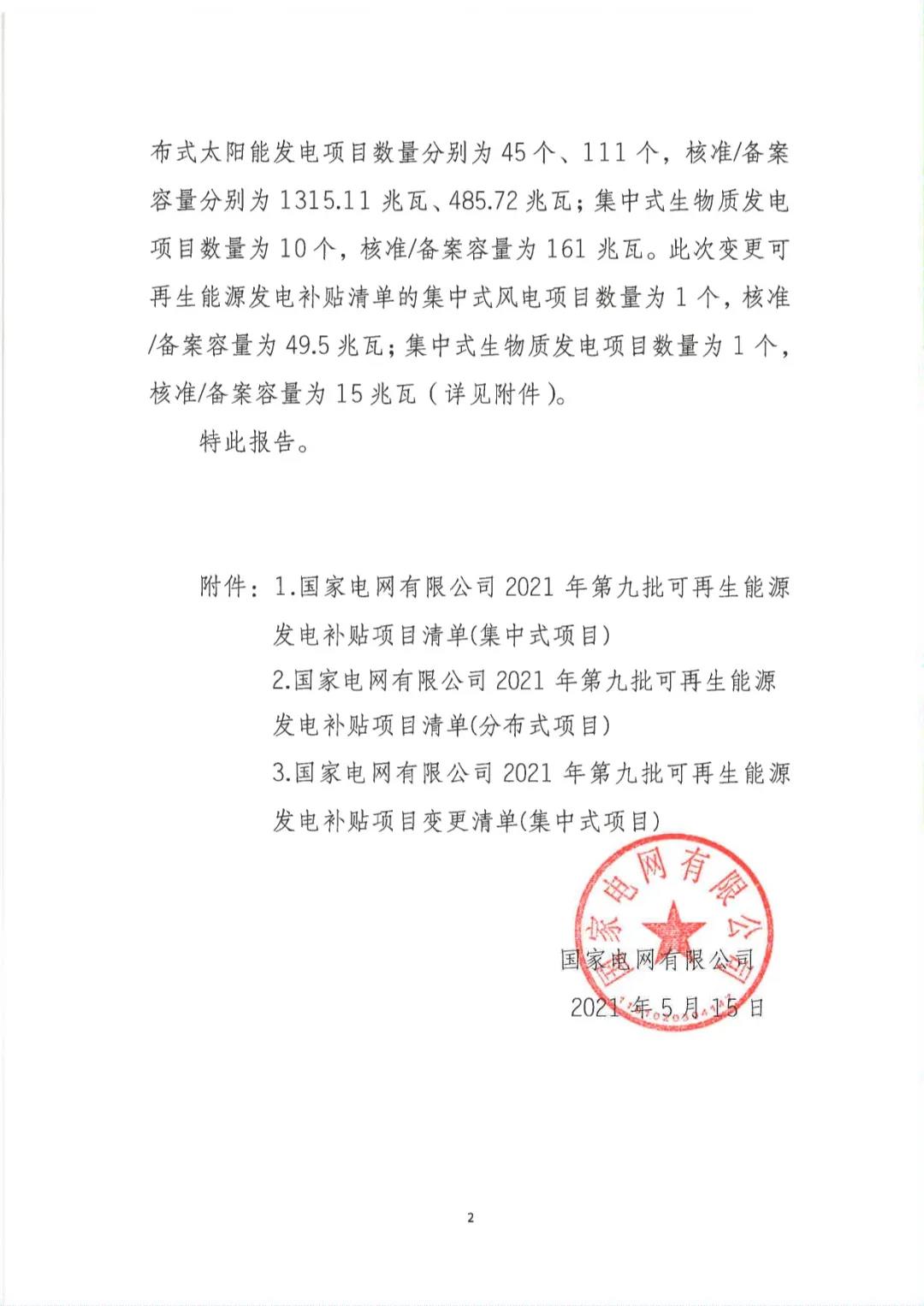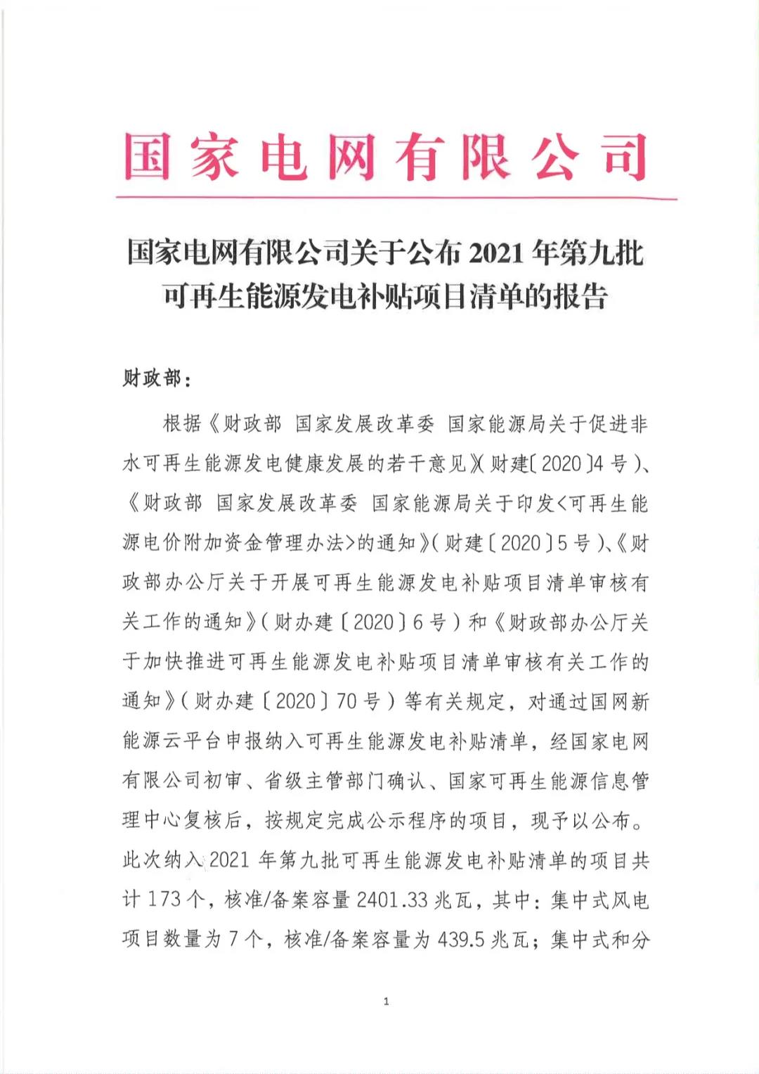 根据《财政部 国家发展改革委 国家能源局关于促进非水可再生能源发电健康发展的若干意见》(财建〔2020〕4号)、《财政部 国家发展改革委 国家能源局关于印发<可再生能源电价附加资金管理办法>的通知》(财建〔2020〕5号)、《财政部办公厅关于开展可再生能源发电补贴项目清单审核有关工作的通知》(财办建〔2020〕6号)和《财政部办公厅关于加快推进可再生能源发电补贴项目清单审核有关工作的通知》(财办建〔2020〕70号)等有关规定,国家电网有限公司积极配合各省级能源主管部门和国家可再生能源信息管理中心,为符合中央财政补助条件的可再生能源发电项目提供补贴清单申报服务。2021年5月15日,我公司已将完成公示的2021年第九批可再生能源发电项目补贴项目清单上报国家主管部门,第九批项目清单及后续项目审核进展情况,请登录新能源云平台查询。