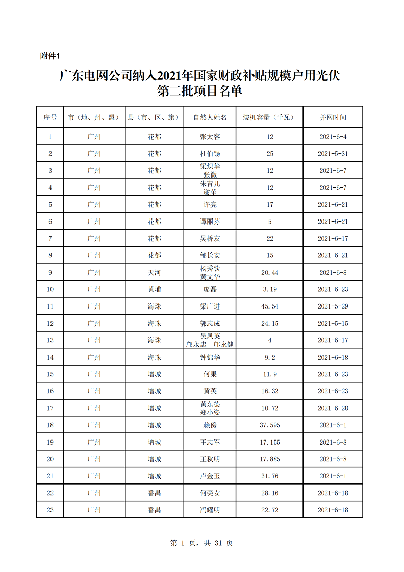 附件1:广东电网公司纳入2021年国家财政补贴规模户用光伏第二批项目名单.pdf