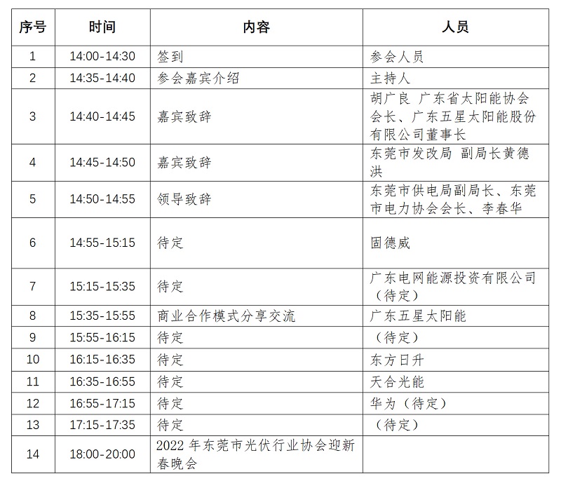 为更好的推动分布式光伏项目的发展,广东省太阳能协会计划联合中科院广州能源所、东莞市光行业协会和广东五星太阳能股份有限公司共同举办“推动碳达峰-促进分布式光伏项目+储能系统技术发展研讨会暨2022年东莞市光伏行业协会迎新春晚会”,具体安排如下: