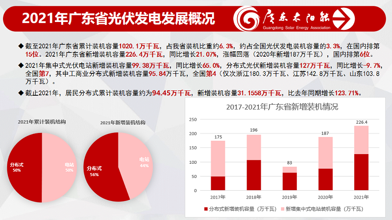 根据国家能源局公布的数据,截至2021年广东省累计装机容量1020.1万千瓦,占我省装机比重约6.3%,约占全国光伏发电装机容量的3.3%,在国内排第15位。2021年广东省新增装机容量226.4万千瓦,同比增长21.07%,涨幅回落(2020年新增187万千瓦),国内排第6位。