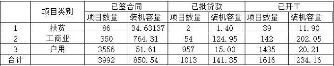 扶贫、工商业和用户的已签合同、已批贷款和已开工项目数量合计3992个,容量850.5446MW。