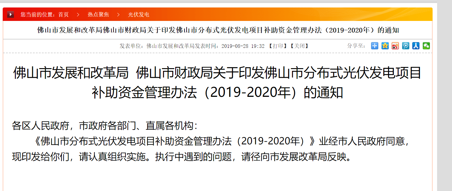 光伏政策出台!佛山市分布式光伏发电项目补助资金管理办法(2019-2020年)的通知