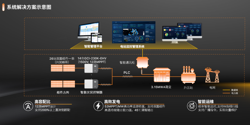 锦浪的解决方案基于12路MPPT24路组串GCI-230K-EHV进行,其最大效率达99%,15A的最大输入电流,IP66的防护等级,其设计具有超强的市场前瞻性。目前,14路MPPT28路组串GCI-230K-EHV-5G已实现全面量产,并已安装于多个大型地面电站项目。