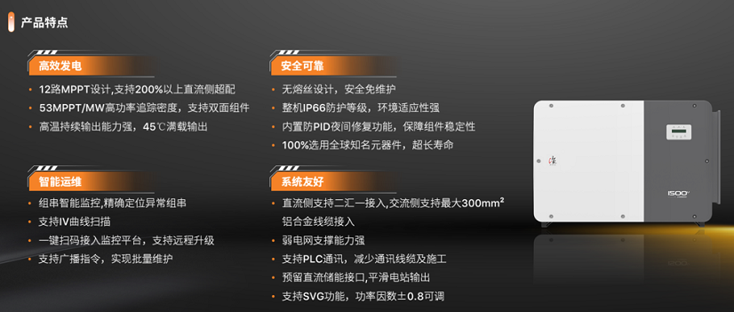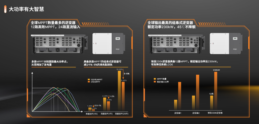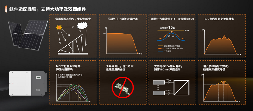 同时具备每串15A电流输入能力和有效适配双面组件PV曲线特性的MPPT算法,可更好的匹配双面组件和大功率组件。