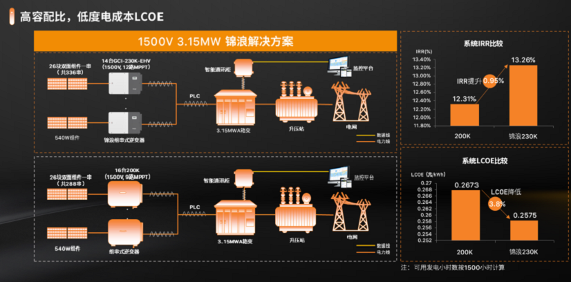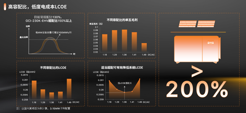 首先,GCI-230K-EHV支持150%以上的直流超配比。若考虑直流二汇一接线方式,其直流超配比可达200%,这适用于世界上任何地方的低LCOE电站设计。