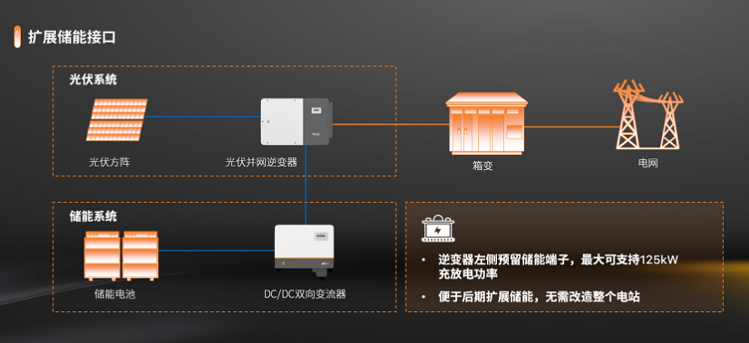 直流侧预留储能接口,支持125kW的充放电功率,便于后期扩展储能,而无需改造整个电站。
