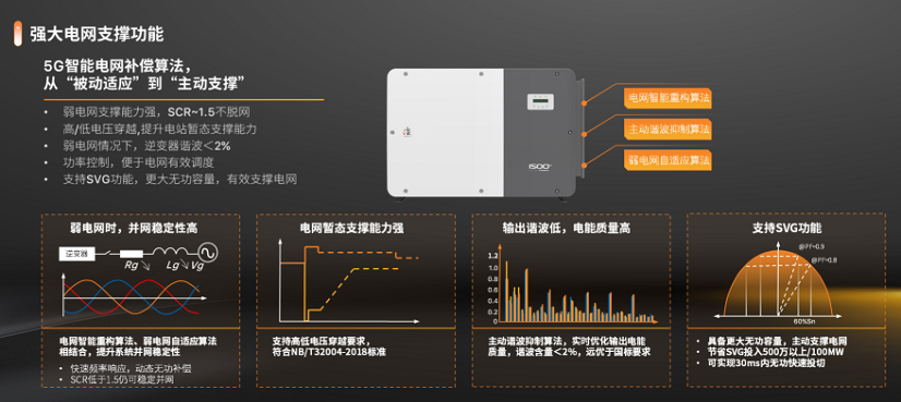 并且GCI-230K-EHV结合了弱电网自适应算法和电网智能重构算法,使得SCR <1.5的区域也可以完美地接入电网,同时具备SVG功能主动为电网提供无功支撑,极大改善电网稳定性。