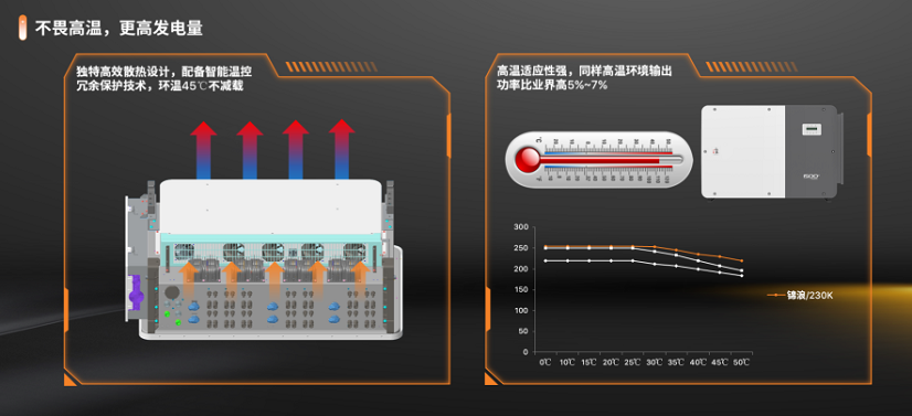 另外,GCI-230K-EHV独特而高效的散热设计以及智能温控、冗余保护等技术应用可使逆变器在环温45°C时仍可满载运行,在相同的高温环境下,其输出功率比其它产品提高5%〜7%,能有效提高光照充足却伴随高温的地面电站项目的发电量。