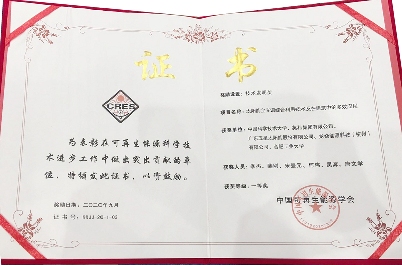 9月20日至22日,2020中国可再生能源学术大会暨第二届云南绿色能源国际论坛在云南昆明举行,同期举行了2020中国可再生能源学会科学技术奖颁奖典礼。以中国科学技术大学、广东五星太阳能股份有限公司(以下简称“五星公司)、英利集团等单位承担的“太阳能全光谱综合利用技术及在建筑中的多效应用”项目获得了科学技术奖一等奖。