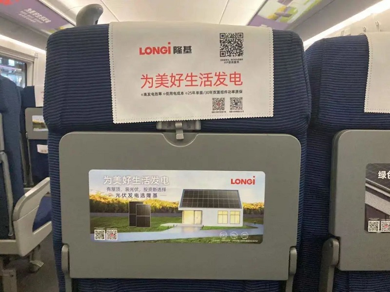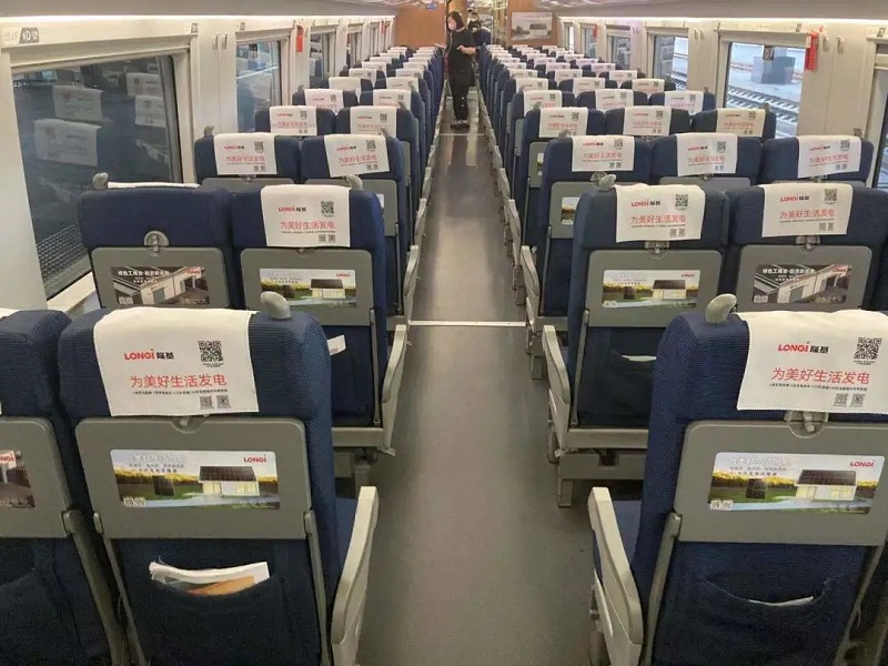 仪式现场,“隆基号”高铁专列整装待发,高铁的头片、桌贴、海报、天幕、车身、语音播报等均充分展示“隆基,为美好生活发电”的品牌口号,同时展示光伏作为绿色能源助力碳中和与乡村振兴的各种美丽要素。