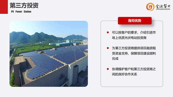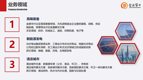 金源华兴立足于“碳中和”,以股东清洁能源、数字金融背景为依托,围绕新能源发电、高端装备制造、清洁城市建设、综合能源利用、教育等核心业务,通过一流的资源整合能力、多元化的产品体系和卓越服务,为客户提供金融与产业增值解决方案,构建“金融服务+供应链保障+产业运营”的清洁能源生态服务系统。