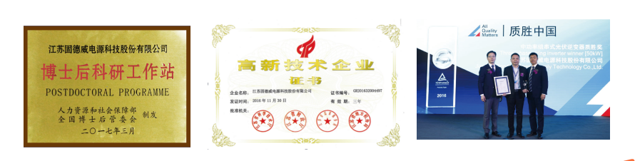 固德威凭借稳定可靠的产品质量广受赞誉,获奖无数。在德国Photon测试中荣获“双A”好评;在2017年通过工信部品牌列名,成为政府推荐品牌;连续三年获得莱茵TUV质胜中国大奖;中高功率段产品系列均获得中国质量认证中心(CQC)领跑者认证证书。同时,本着对用户负责的态度,固德威也为旗下全线产品购买了产品责任险、错误与疏漏险,确保全球用户的安心使用;全新一代产品外观,斩获国际设计大奖红点奖,开辟了时尚工业美学的新潮流。不仅如此,固德威还先后荣获政府列名“高新技术企业”、“省工程技术中心”、“省博士后创新基站”、“省研究生工作站”、 “最佳雇主”等荣誉称号。 固德威ES系列双向储能逆变器更是荣获政府列名“高新技术产品”, 储能产品技术水平全球领先。