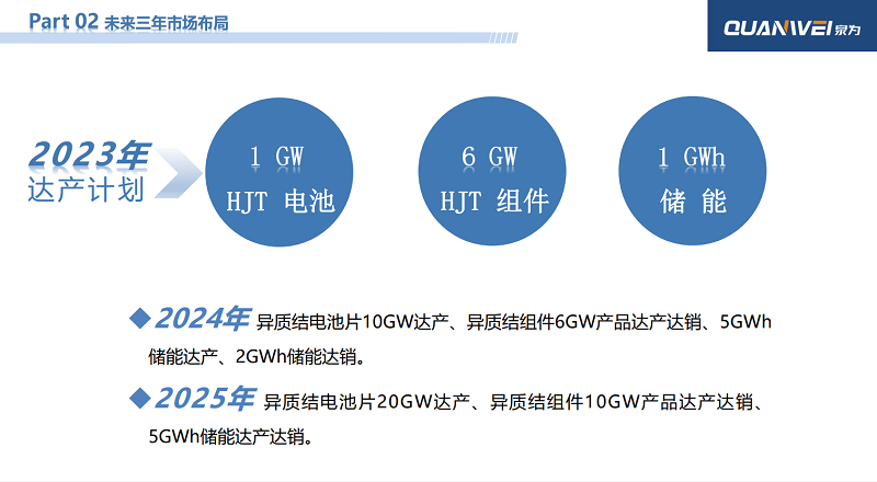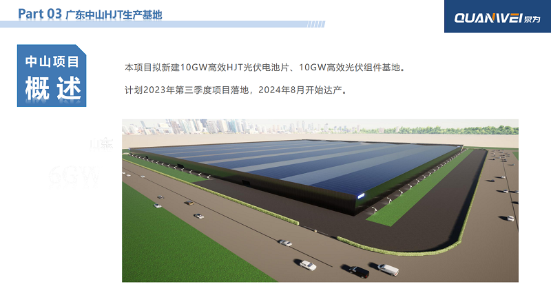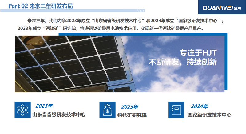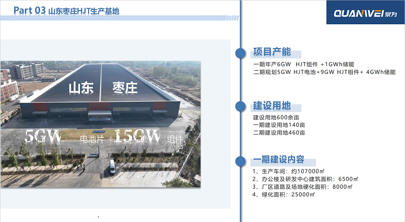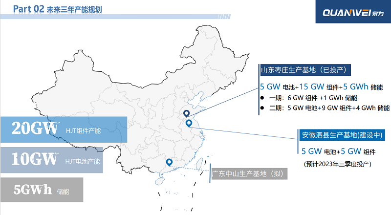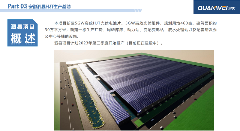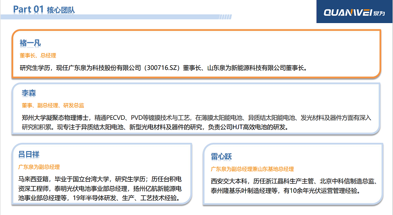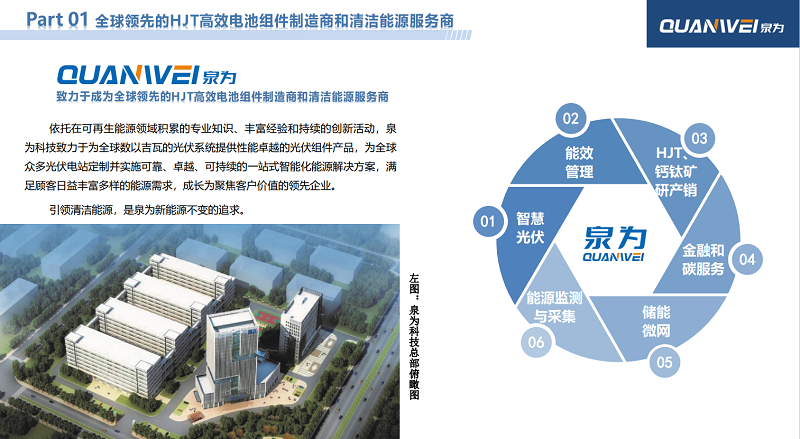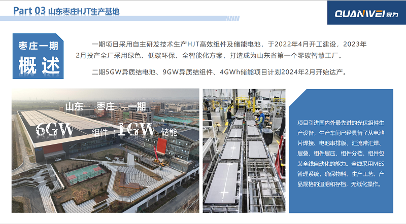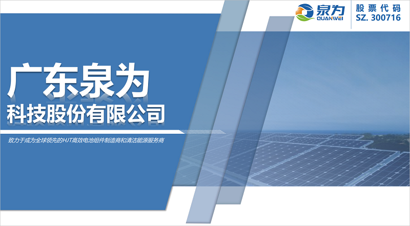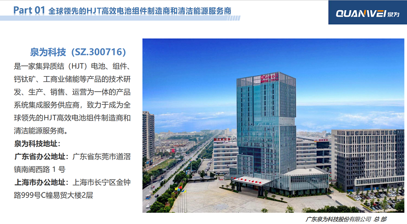 泉为科技(SZ.300716)创立于2002年,2017年在深圳证券交易所创业板上市,国家级高新技术企业,广东省太阳能协会副会长单位。经过多年的发展和转型布局,公司转型为一家集异质结电池、组件、钙钛矿、工商业储能等产品的技术研发、生产、销售、运营为一体的光伏高科技企业,致力于成为全球领先的HJT高效电池组件制造商和清洁能源服务商。依托在可再生能源领域积累的专业知识、丰富经验和持续的创新活动,泉为科技已布局拥有山东基地(枣庄市)、安徽基地(泗县)和上海营销中心总部,未来还将投建广东基地和西北基地,形成泉为科技四大基地和一个总部营销中心格局。目前,山东基地一期6GW高效异质结光伏组件和1GWh储能产能已实现量产,安徽基地正在建设并预计在2023年第三季度建成投产。泉为科技山东基地和安徽基地全部建成后,将拥有10GW高效HJT光伏电池片、20GW高效HJT光伏组件和5GWh储能的总体产能。
