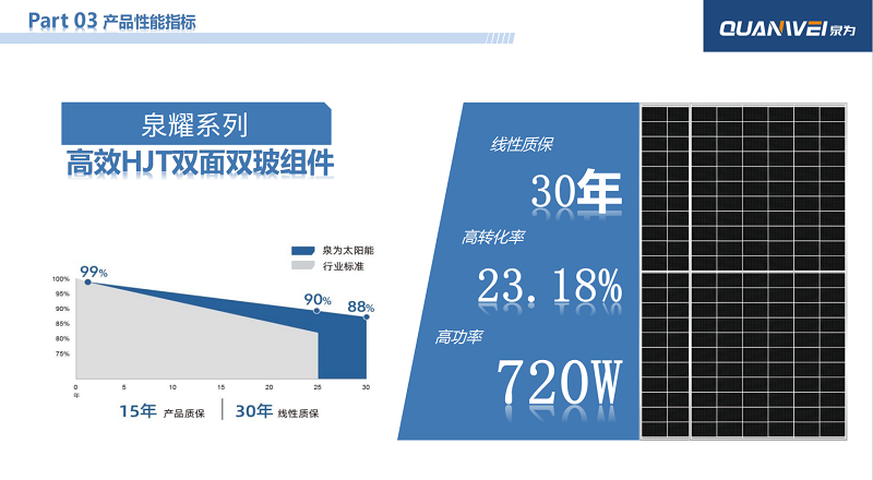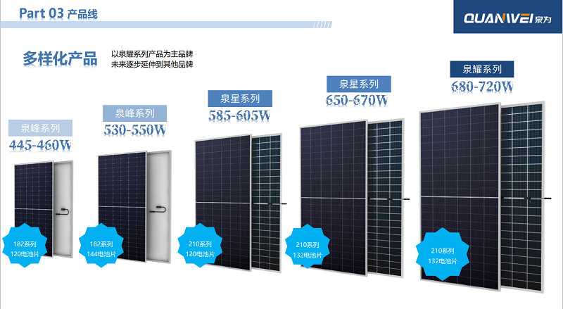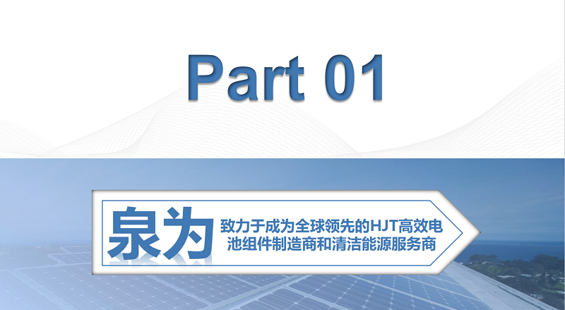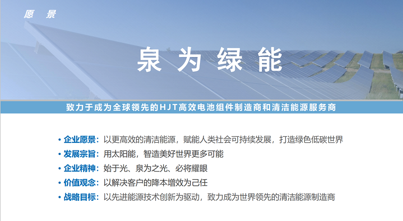 公司拥有20多项发明专利,并于今年2月在业内率先推出720W大功率“泉耀系列高效异质结组件”,将可持续为全球数以吉瓦的光伏系统提供性能卓越的光伏组件产品和服务,满足全球市场丰富多样的能源需求,为全球贡献泉为之力,贡献泉为之光!