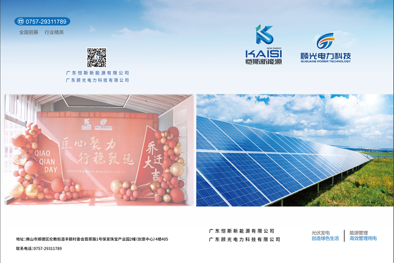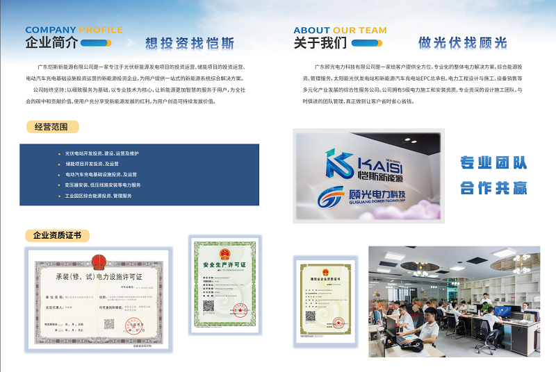 广东顾光电力科技有限公司是一家给客户提供全方位、专业化的整体电力解决方案,综合能源投资、管理服务,太阳能光伏发电站和新能源汽车充电站EPC总承包、电力工程设计与施工、设备销售等多元化产业发展的综合性服务公司。公司拥有5级电力施工和安装资质、专业资深的设计施工团队,与时俱进的团队管理,真正做到让客户省时省心省钱。