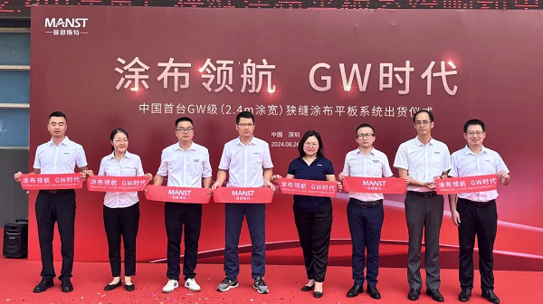 2024年8月26日,由副会长单位深圳市曼恩斯特科技股份有限公司自主研发的中国首台GW级(2.4m涂宽)狭缝涂布平板系统正式对外出货,以“涂布领航,GW时代”为主题的出货仪式于当天上午9:30开始,曼恩斯特董事长及相关负责人均莅临现场,共同见证了这一激动人心的时刻。