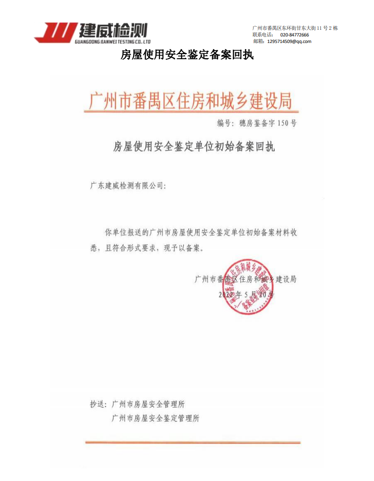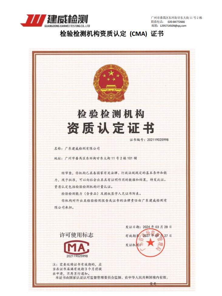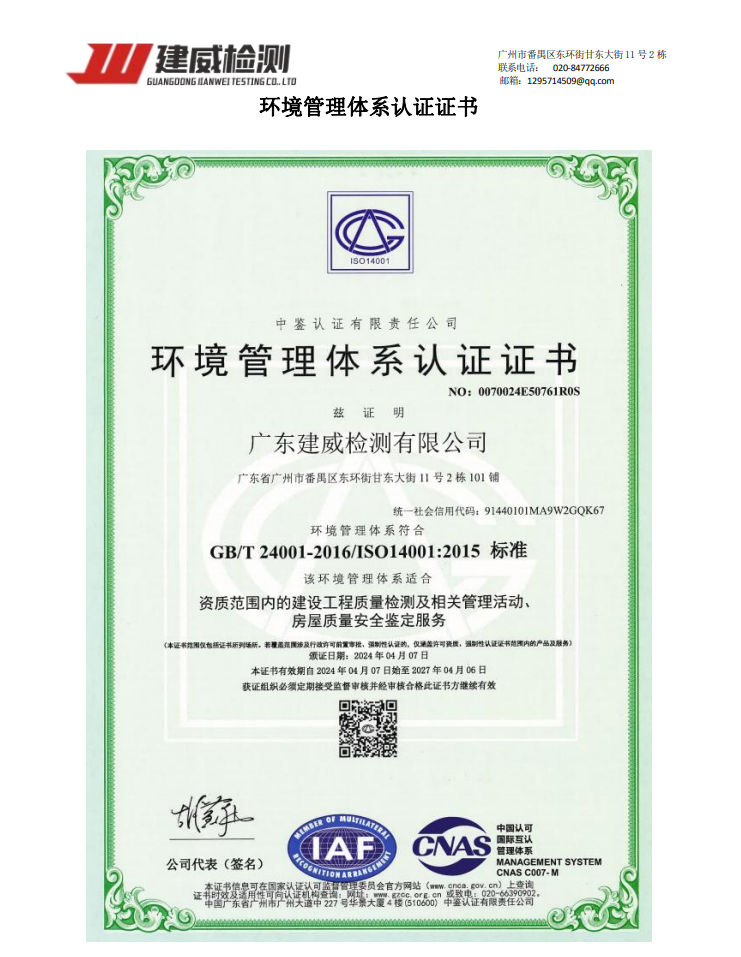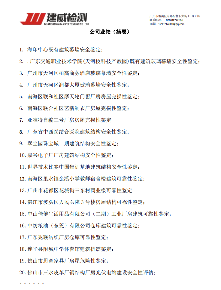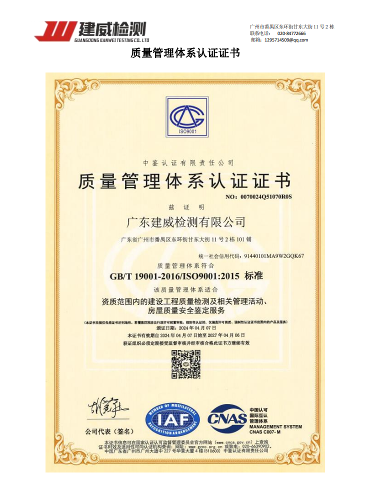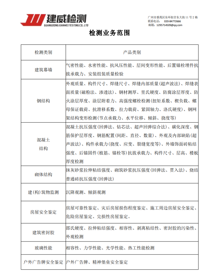 广东建威检测有限公司(以下简称公司)是在广州市番禺区市场监督管理局注册登记的独立法人第三方专业检验检测机构。公司具有检验检测机构资质认定(CMA)、建设工程质量检测机构许可、房屋使用安全鉴定许可资格。公司通过了IS09001质量管理体系、IS014001环境管理体系、IS045001职业健康安全管理体系认证。公司专注于建筑主体结构、建筑幕墙、钢结构工程领域,为客户一站式提供相关的CMA计量认证检测、建设工程质量检测鉴定、房屋安全检测鉴定、安全检查评估服务。