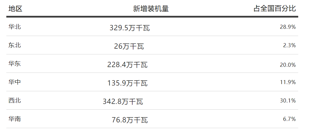 从新增装机布局来看,2019年上半年,华北地区新增装机329.5万千瓦,占全国的28.9%;东北地区新增装机26.0万千瓦,占全国的2.3%;华东地区新增装机228.4万千瓦,占全国的20.0%;华中地区新增装机135.9万千瓦,占全国的11.9%;西北地区新增装机342.8万千瓦,占全国的30.1%;华南地区新增装机76.8万千瓦,占全国的6.7%。