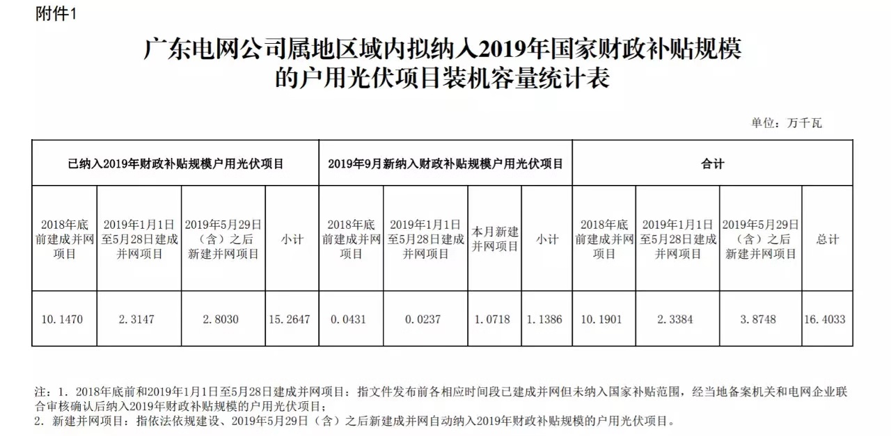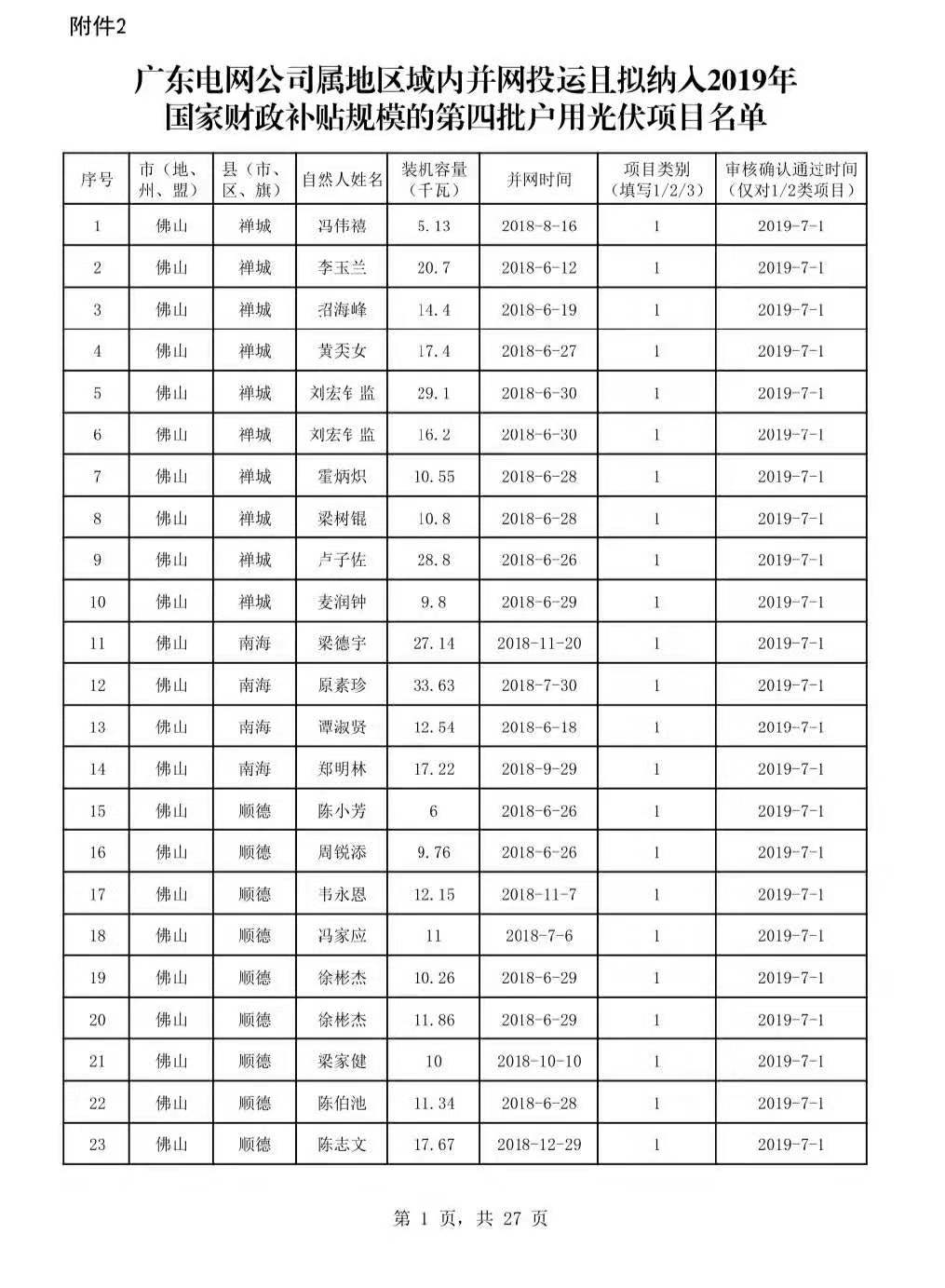 1.广东电网公司属地区域内拟纳入2019年国家财政补贴规模的户用光伏项目装机容量统计表 2.广东电网公司属地区域内并网投运且拟纳入2019年国家财政补贴规模的第四批户用光伏项目名单