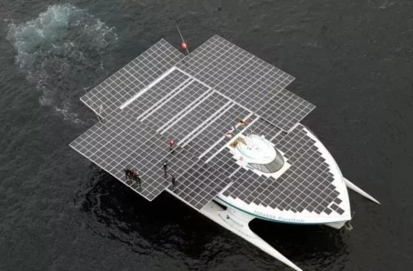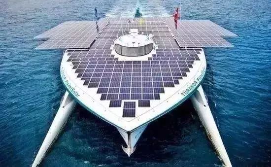 世界最大的太阳能船PlanetSolar,船长31米、宽15米、高7.5米,重95吨,配备了536.65平方米光伏太阳能电池板,由38000枚太阳能电池交错排列而成,另有72枚锂离子电池储存吸收到的阳光。依靠太阳能供电,PlanetSolar最高时速可达25公里/小时,操作宁静无污染。它的外形像蝴蝶,是目前世界上第一艘、也是现时世界上最大型的全太阳能远洋船“图兰星球太阳”号。它将和泰坦尼克号一样载入史册。
