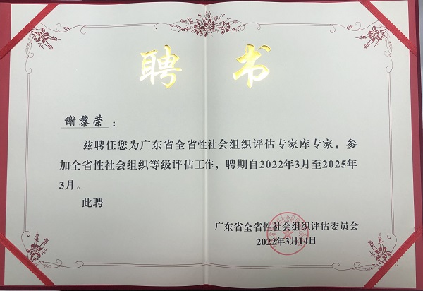 2022年3月15日,在广东省社会组织管理局、广东省全省性社会组织评估委员会举办的广东省全省性社会组织评估专家培训班上,我会党支部书记谢黎荣同志再次被聘为广东省全省性社会组织评估专家库专家。本次培训班旨在提升评估专家业务水平,确保全省性社会组织评估工作有序开展。来自高校、律师事务所、社会组织、会计师事务所的评估专家分别在线上参加了本次培训活动。