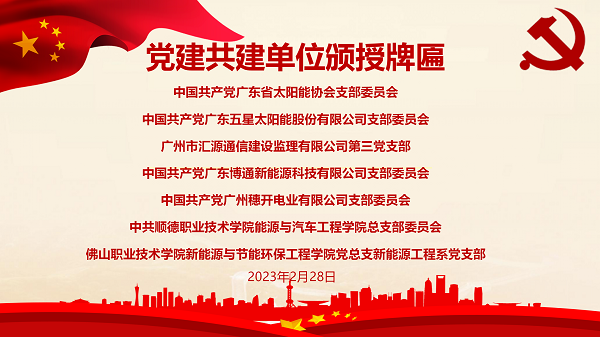 为深入贯彻落实党的二十大精神,学习掌握习近平新时代中国特色社会主义思想,实现以党建促会建,构建“资源共享、优势互补、互相促进、共同提高”的党建工作新格局,中共广东省太阳能协会支部委员会与中共广东五星太阳能股份有限公司支部委员会、广州市汇源通信建设监理有限公司第三党支部、中共广东博通新能源科技有限公司支部委员会、中共广州穗开电业有限公司支部委员会、中共顺德职业技术学院能源与汽车工程学院总支部委员会、佛山职业技术学院新能源与节能环保工程学院党总支新能源工程系党支部等七家党组织在平等、互利、合作、共赢的基础上,结对为党建共建单位。