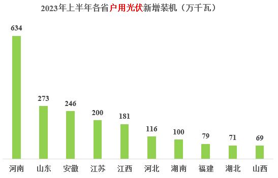 2023年上半年户用装机规模为2152万千瓦,前三的省份分别为:河南、山东、河北;前十省份合计1969万千瓦,占到全国新增光伏装机的91%。新增光伏总装机前十省份的具体情况如下图所示。
