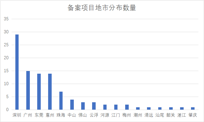 从各地市分布情况来看,备案项目地市分布数量排名前三的分别是深圳市、广州市、东莞市、惠州市,深圳以29个项目位居第一,广州为15个,东莞和惠州均为14个。