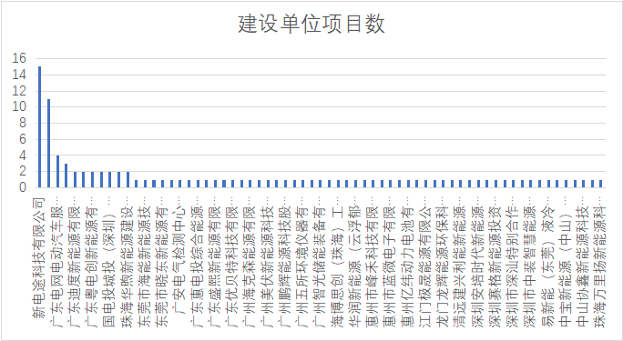 从建设单位来看,总计有65家建设单位参与,其中承担项目数量最多的建设单位为新电途科技有限公司的广东省深圳市储能项目。