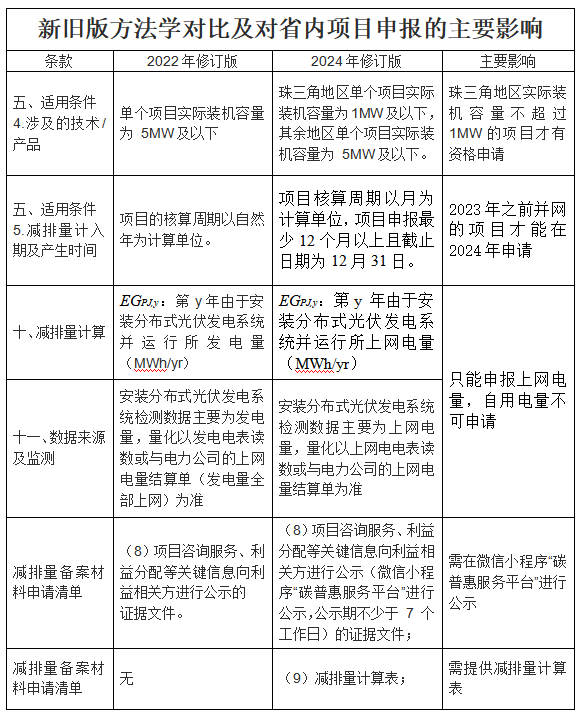 2024年1月18日,广东省生态环境厅印发《广东省安装分布式光伏发电系统碳普惠方法学 (2024年修订版)》,对于省内分布式光伏碳普惠核证减排量申请规则作出重要调整。分布式光伏项目申报核算的发电量仅包含上网电量,自发自用电量将无法通过省内碳普惠获得减排收益。