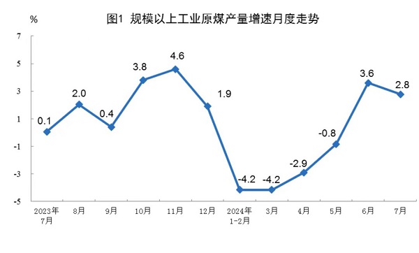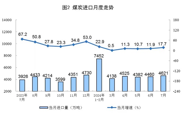 原煤生产平稳增长。7月份,规上工业原煤产量3.9亿吨,同比增长2.8%,增速比6月份放缓0.8个百分点;日均产量1259.2万吨。进口煤炭4621万吨,同比增长17.7%。