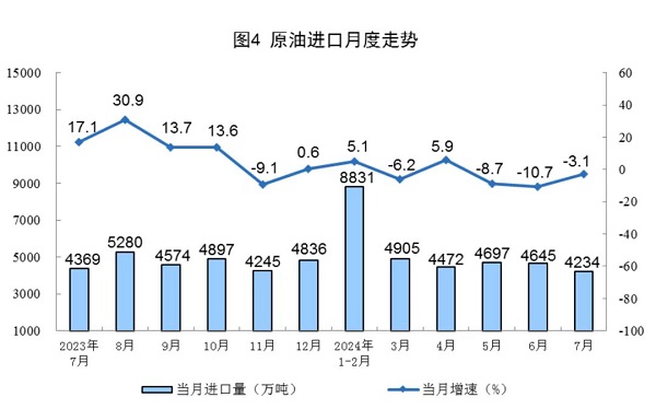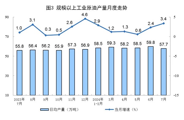 原油生产增速加快。7月份,规上工业原油产量1790万吨,同比增长3.4%,增速比6月份加快1.0个百分点;日均产量57.7万吨。进口原油4234万吨,同比下降3.1%。