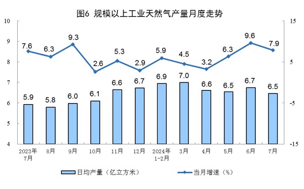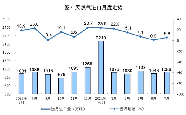 天然气生产稳定增长。7月份,规上工业天然气产量200亿立方米,同比增长7.9%,增速比6月份放缓1.7个百分点;日均产量6.5亿立方米。进口天然气1086万吨,同比增长5.6%。