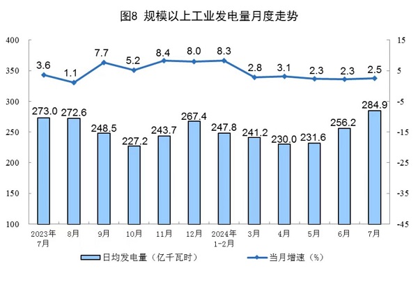 规上工业电力生产略有加快。7月份,规上工业发电量8831亿千瓦时,同比增长2.5%,增速比6月份加快0.2个百分点;规上工业日均发电284.9亿千瓦时。1—7月份,规上工业发电量53239亿千瓦时,同比增长4.8%。