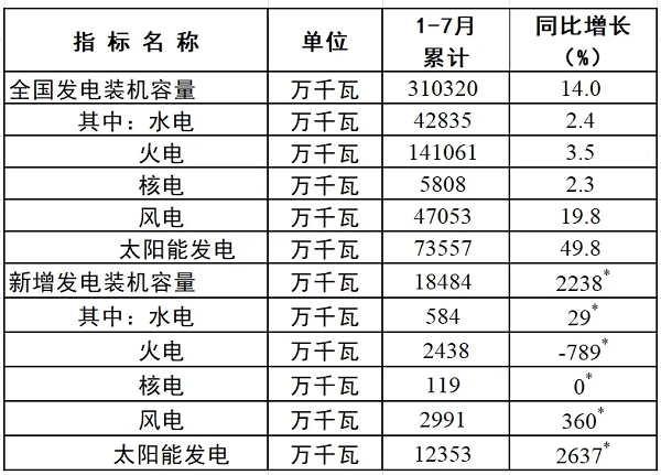 截至7月底,全国累计发电装机容量约31.0亿千瓦,同比增长14.0%。其中,太阳能发电装机容量约7.4亿千瓦,同比增长49.8%;风电装机容量约4.7亿千瓦,同比增长19.8%。