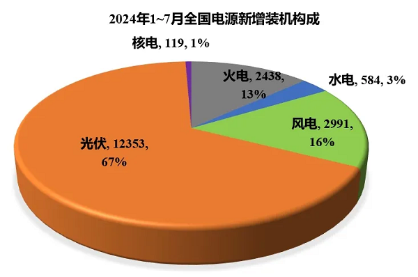 2024年1~7月,光伏新增装机占全国电源新增装机的67%,各类电源的新增占比如下图所示。