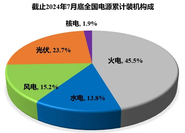 截止2024年7月底,光伏累计装机占全国电源累计装机的23.7%,各类电源的累计占比如下图所示。