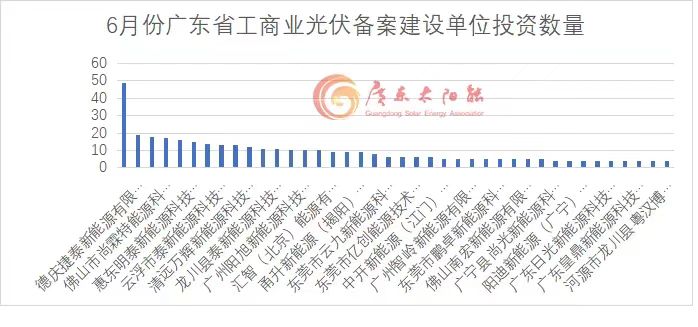 从建设单位投资数量来看:德庆捷泰新能源有限公司备案工商业项目最多,为49个;云浮市特泰新能源有限公司为19个;佛山市尚霖特能源科技有限公司为18个。