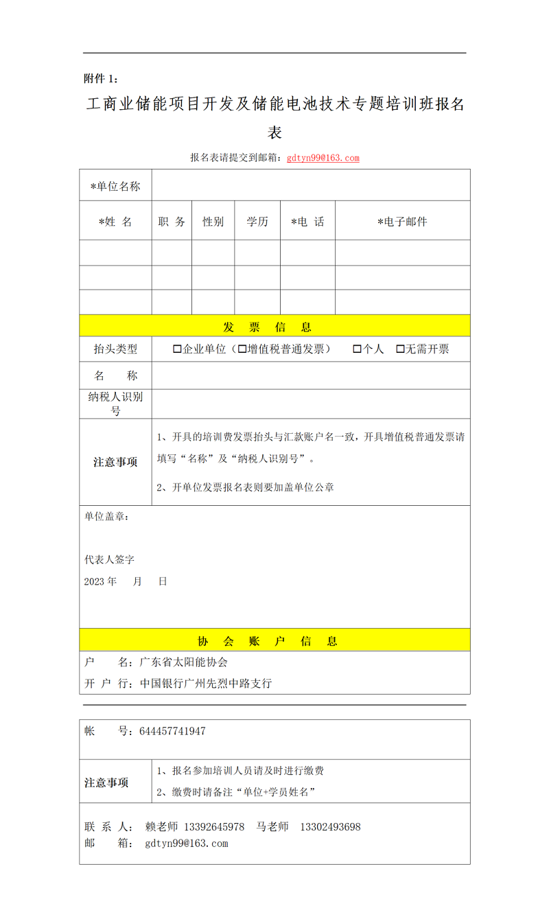 1:工商业储能项目开发及储能电池技术专题培训班报名表,并提交到邮箱gdtyn99@163.com,或识别海报中二维码登记。