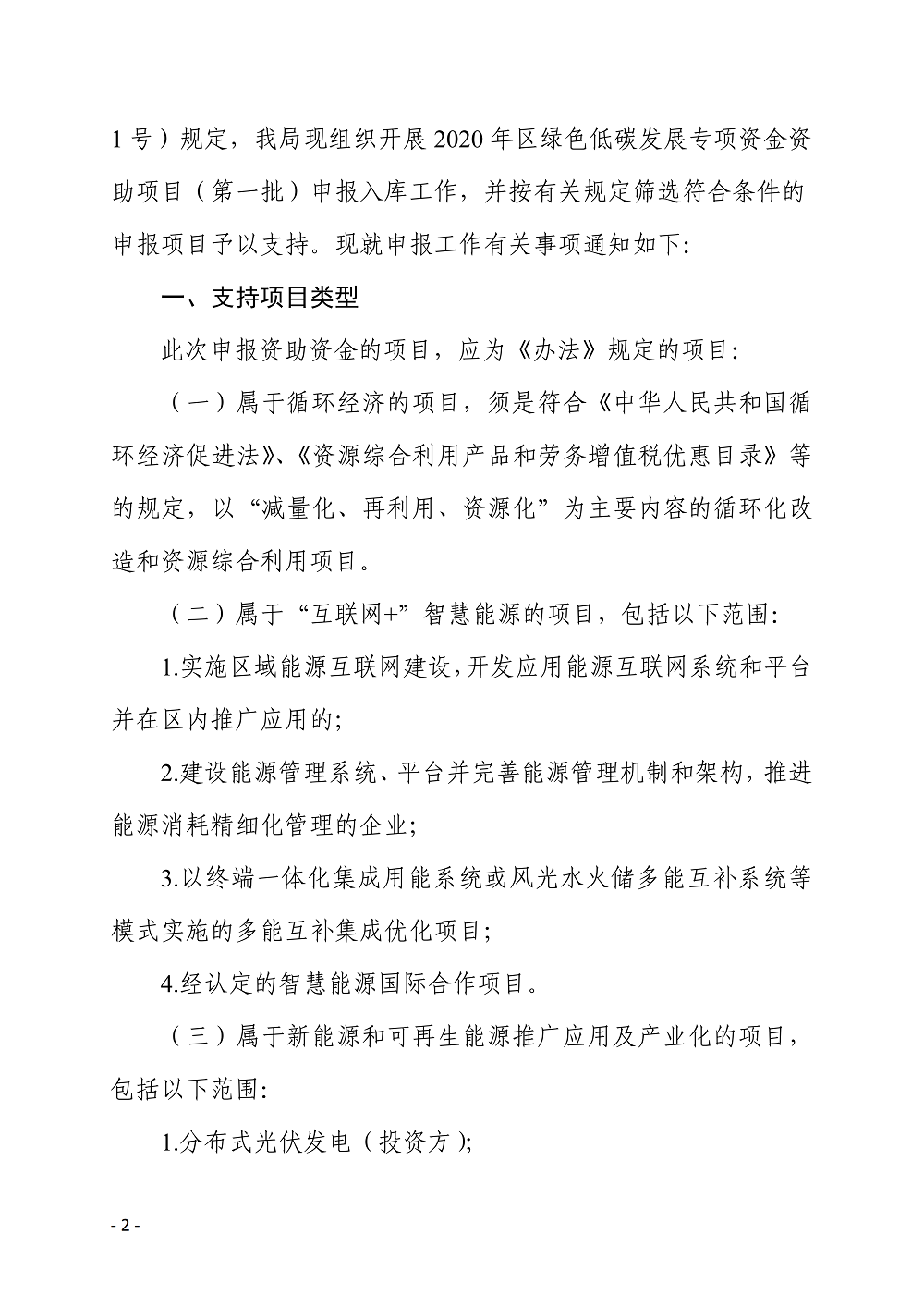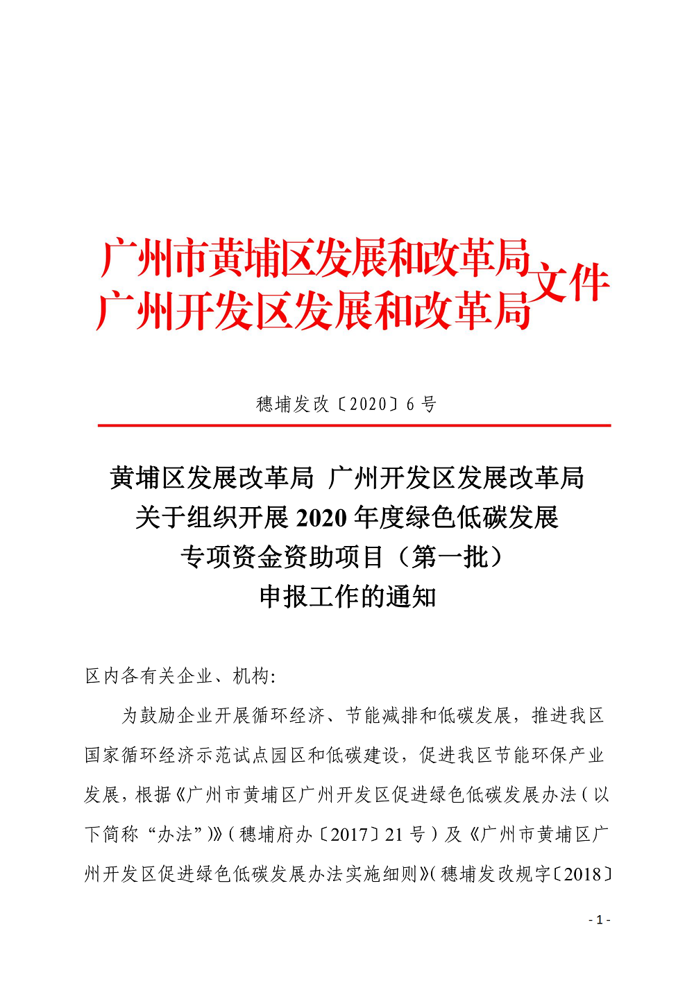 关于组织开展 2020 年度绿色低碳发展 专项资金资助项目(第一批) 申报工作的通知