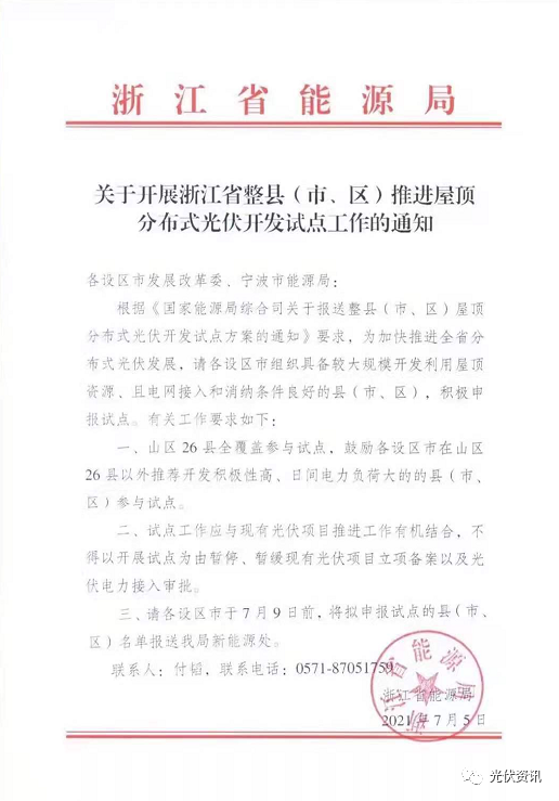 浙江省能源局下发关于开展浙江省整县推进屋顶分布式光伏开发试点工作的通知,明确提出不得以开展试点为由暂停、暂缓现有光伏项目立项备案以及光伏电力接入审批。