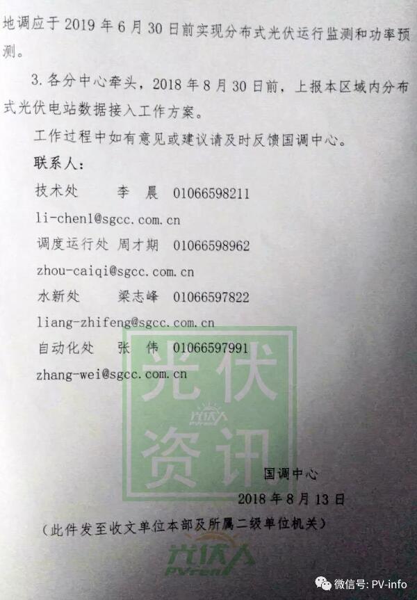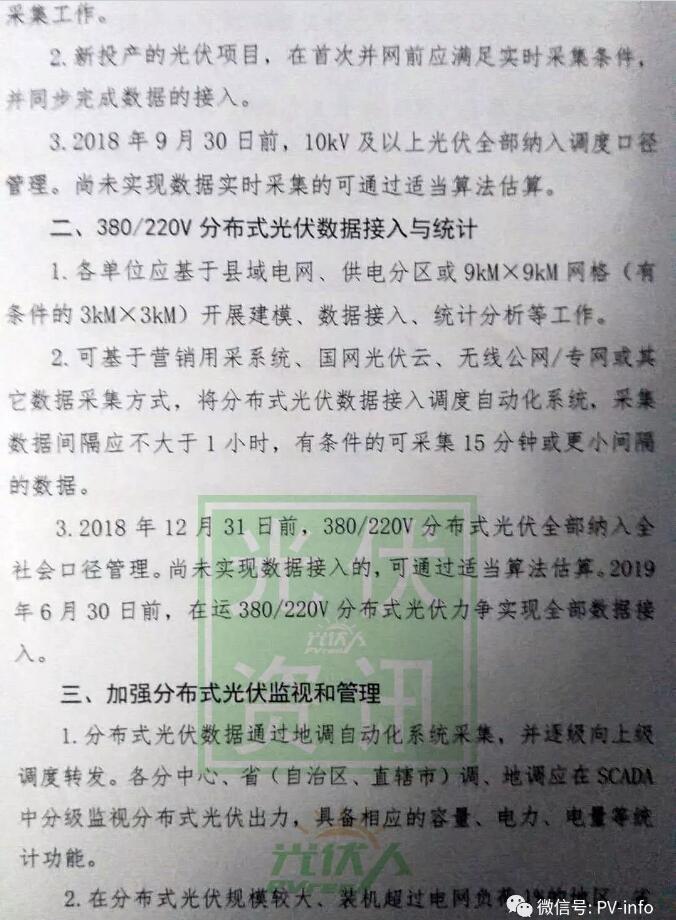 近日,国家电网有限公司发布《国调中心关于加强分布式光伏数据采集工作的通知》,10kV及以上光伏应接入调度自动化系统,逐步实现实时采集;2018年10月31日前,380/220V分布式光伏全部纳入社会口径管理,2019年6月30日前,在运380/220V分布式光伏力争实现全部数据接入。