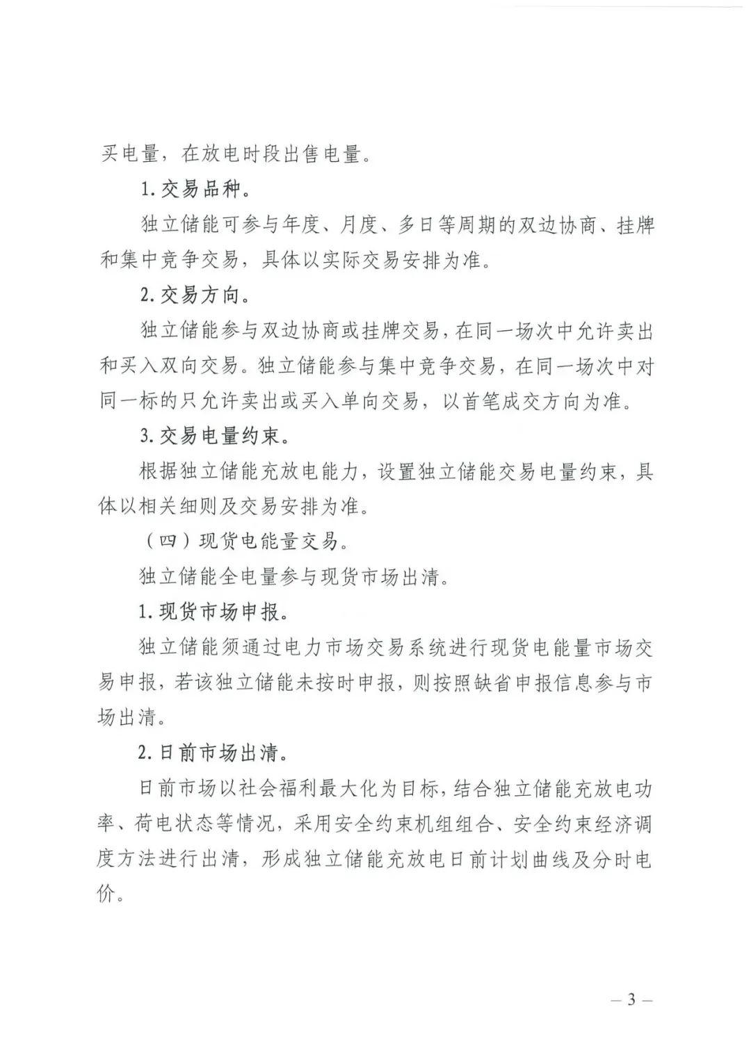 《方案》中规定,独立储能还可参与现货电能量交易,以独立储能全电量参与现货市场出清,通过现货市场申报、日前市场出清、实时市场出清三种方式实现交易。现货市场充放电价格均采用所在节点的分时电价。