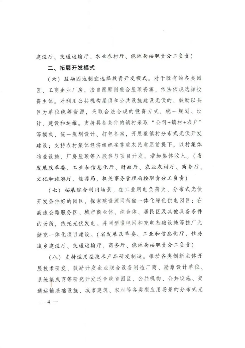 支持具备条件的镇村采取“公司+镇村+农户” 等模式,统一规划设计、打包备案,开展整镇村分布式光伏开发建设;支持农村集体经济组织在尊重农民意愿前提下,以村集体物业设施、厂房屋顶等入股参与项目开发,增加集体收入。
