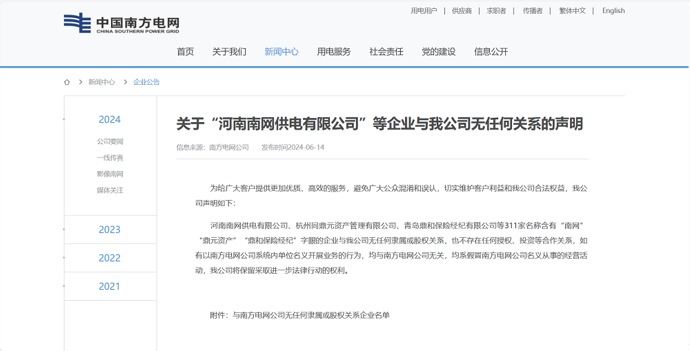 6月14日,南方电网公司发布《关于“河南南网供电有限公司”等企业与我公司无任何关系的声明》。其中指出,河南南网供电有限公司、杭州同鼎元资产管理有限公司、青岛鼎和保险经纪有限公司等311家名称含有“南网”“鼎元资产”“鼎和保险经纪”字眼的企业与公司无任何隶属或股权关系,也不存在任何授权、投资等合作关系。