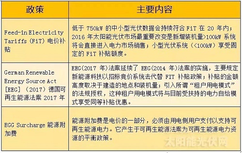在中国成为世界光伏第一装机大国之前,德国一直占据全球光伏应用第一大国称号,这其中光伏补贴起到一定助推作用,但光伏电站的高额补贴让德国能源转型负担沉重,所以近年欧盟各国的大方向是减少光伏补贴,使之更为市场化。德国作为欧盟的典型代表,其并网补贴自2009年后也大幅减少。以装机容量30kW的居民屋顶项目为例,并网补贴价格从2004年0.57欧元/kWh的历史高位,一路降低到2014年的0.12欧元/kWh。2016年6月通过《可再生能源法》改革方案,德国自2017年起将不再以政府指定价格收购绿色电力,而是通过市场竞价发放补贴。其余欧盟国家:瑞士、丹麦、意大利等国无一例外计划减少甚至计划取消光伏FiT补贴。近年德国主要光伏政策如下表: